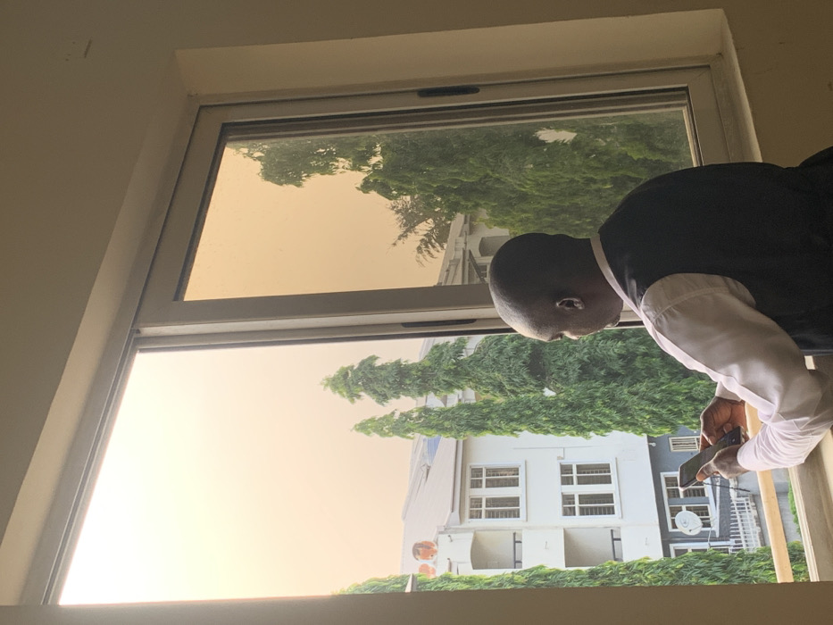A person wearing a vest and white shirt is looking out a window. They are holding a mobile phone in their right hand. Outside the window, there are tall green trees and a white building with multiple windows. The sky has a golden or yellowish hue, possibly from the sun or smog. The window frame is light-colored. The person is bald and appears to be gazing at something outside.