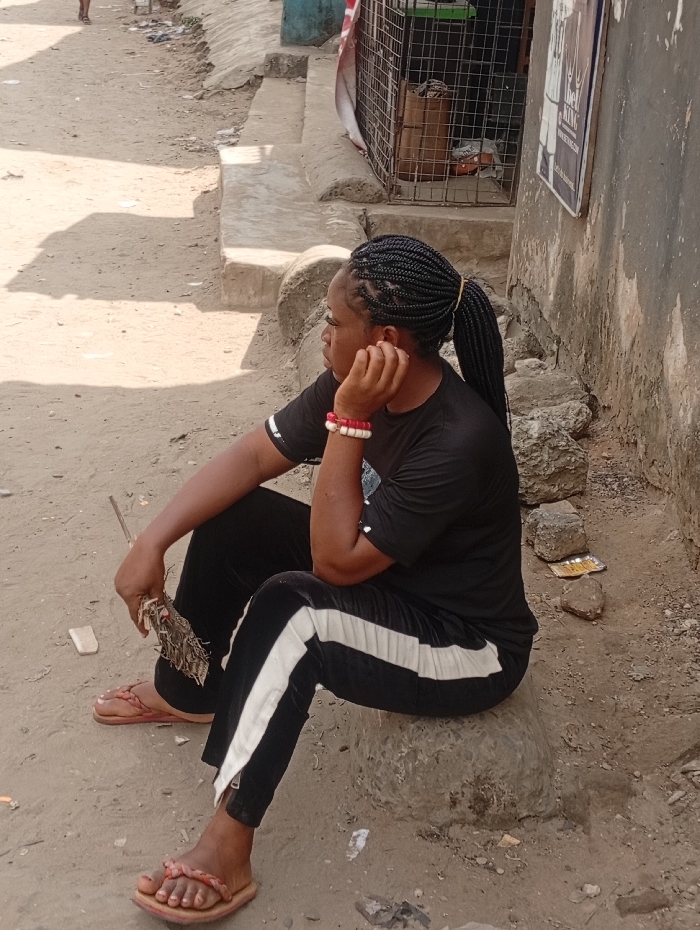 In the city of Aba, Nigeria, a woman is seated on a low, irregular concrete structure, possibly a curb, facing left of the frame