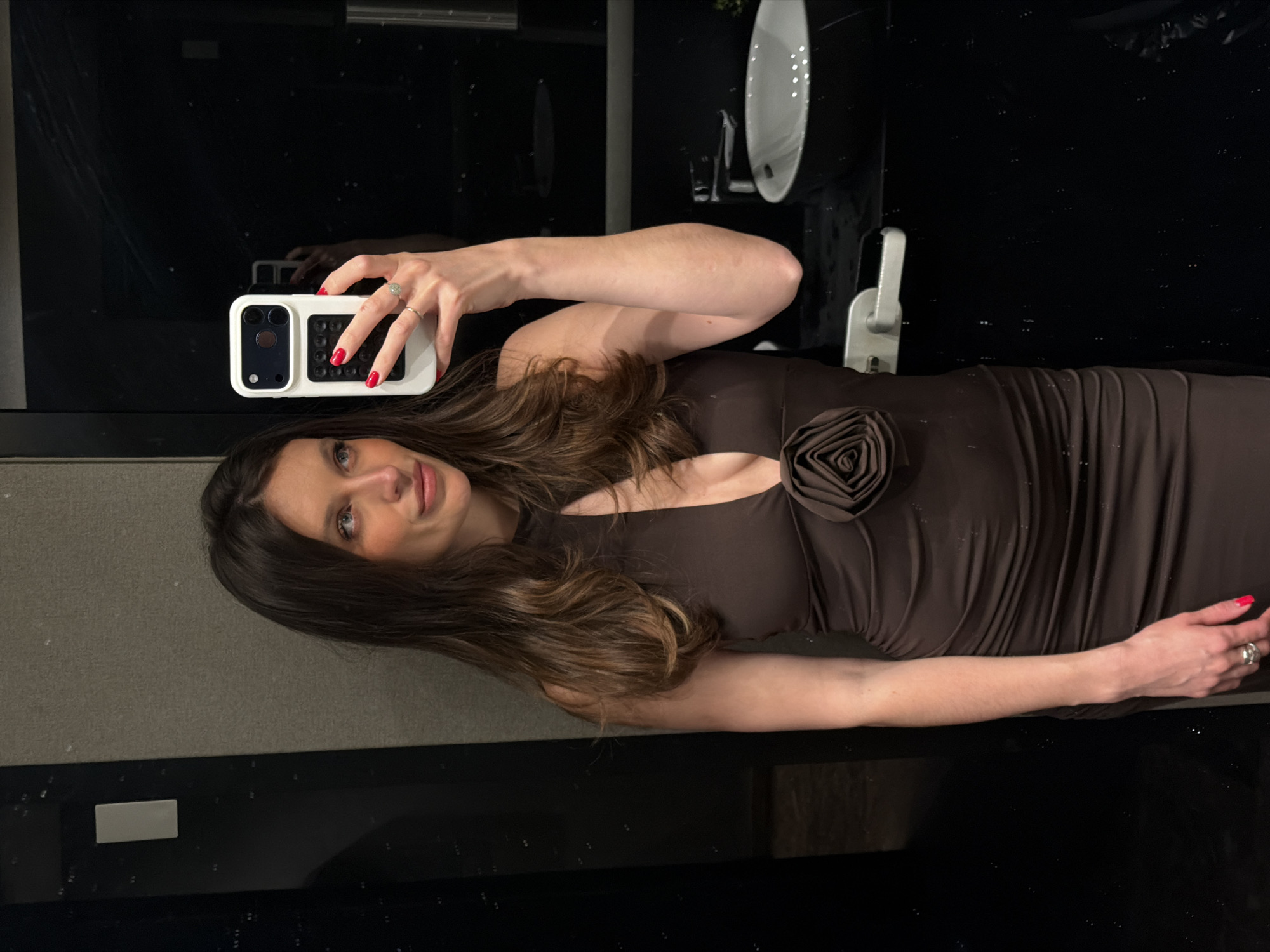 A woman stands in a bathroom, taking a selfie. She has long, dark hair and is wearing a brown dress with a flower detail. The bathroom has a modern aesthetic with black countertops and a white sink. The location in the city of Budva, Montenegro, is not apparent from the image.