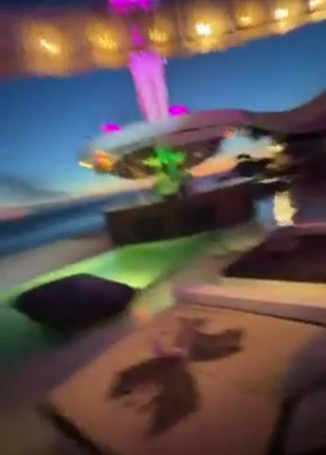 A woman in a black bikini top smiles at the camera at an outdoor nightclub. The camera is at chest level, pointed up at the woman. The club has lit-up tables and a pool, and the sky is dark blue. There are palm trees in the background. The woman is smiling and seems to be enjoying herself.