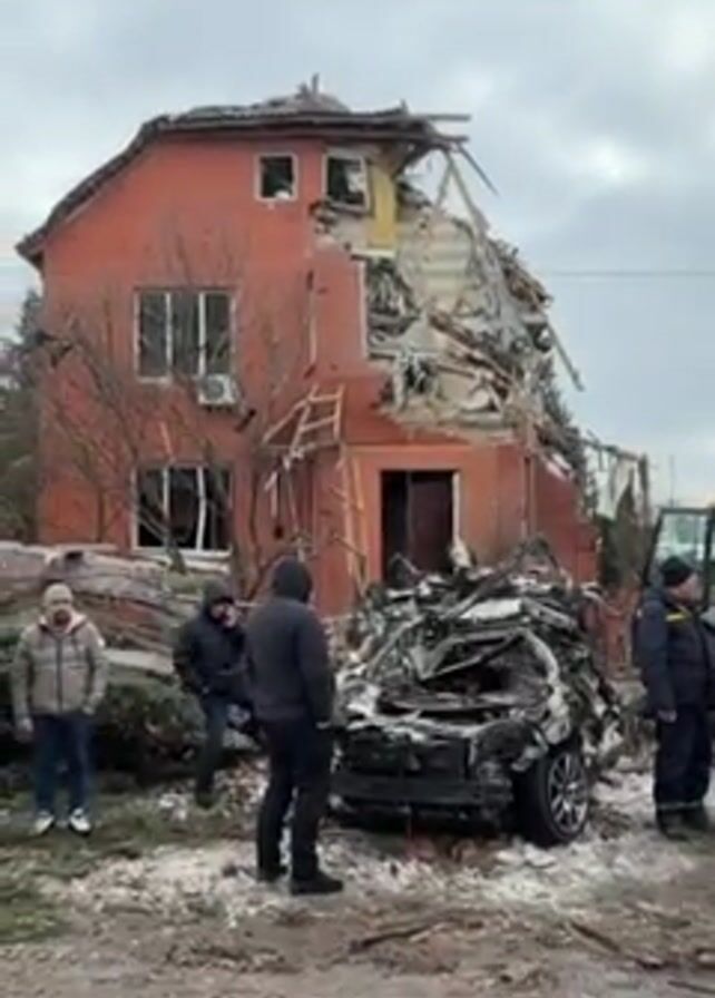two-story red brick house with extensive damage to its upper portion, revealing exposed framing and debris. In front of the house is a severely damaged, burned-out car, its wreckage a mangled mass of metal. Several people are standing around the scene, observing the destruction. One man is wearing a jacket and jeans, another a hooded sweatshirt. A person in uniform stands near a piece of construction equipment at the edge of the scene. The ground is muddy, with patches of snow or frost. The sky is overcast. The scene suggests the aftermath of a significant explosion or destructive event.