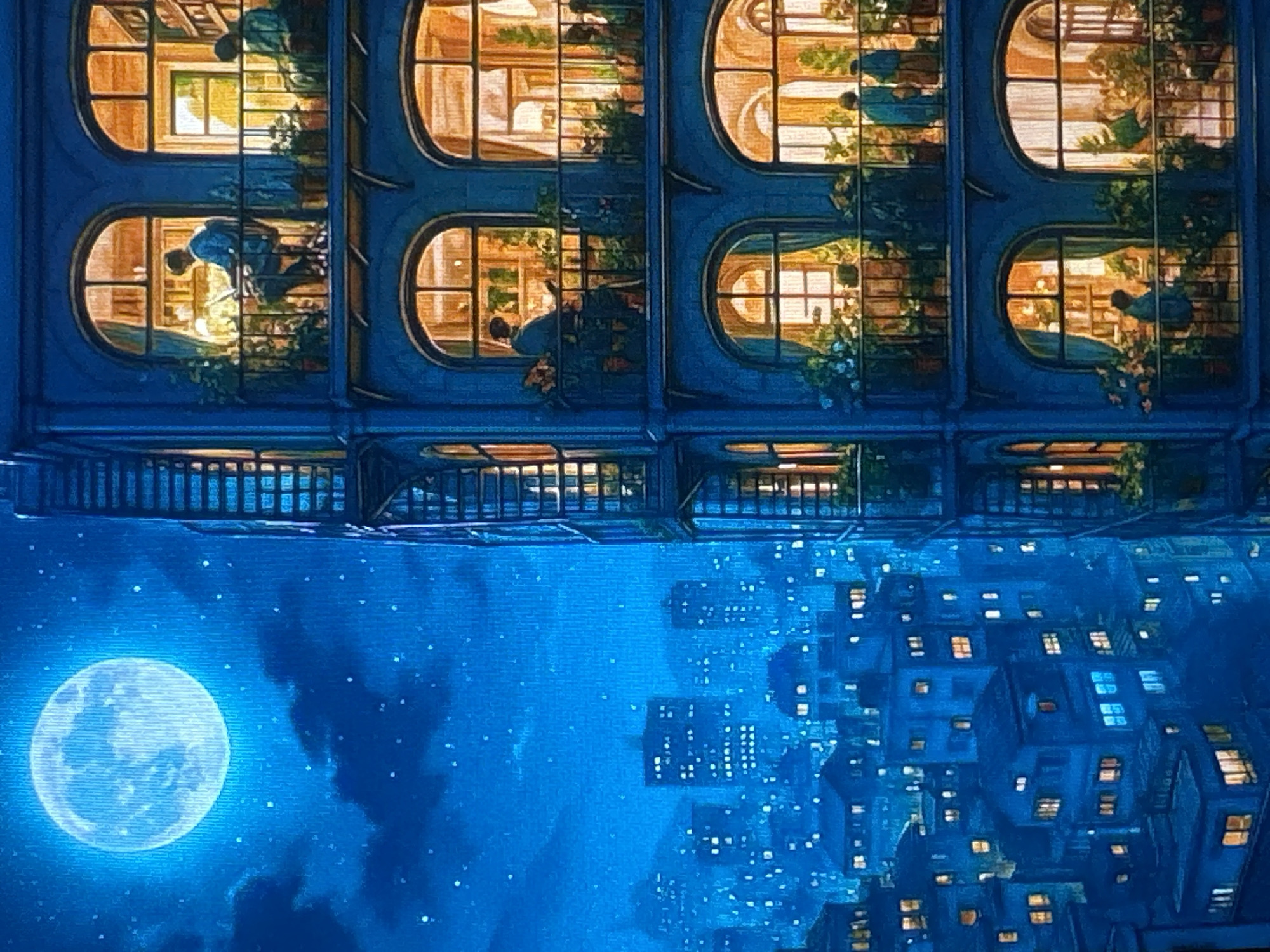The image depicts an illustrated nocturnal urban scene set in Budapest, Hungary. A large, luminous full moon is prominent in the upper left, illuminating a dark blue sky with scattered clouds and subtle light specks. On the right, a multi-story building, painted in a dark blue hue, occupies the foreground. An external, vertical staircase is visible on the left side of this building. It features four visible floors, each with balconies enclosed by black wrought-iron railings and densely populated with potted plants. Warm, yellow light emanates from the building's arched windows. On the top floor, a person sits on the left balcony, illuminated by a light source positioned on a table in front of them, resembling a laptop screen. Another person is seated on the top floor's right balcony. The second floor's left balcony shows a seated person holding an object. Two figures are visible within the room behind the second floor's right balcony. The third floor's left balcony features a person seated at a surface. On the third floor's right balcony, two figures are present, one standing and one positioned closer to the plants. The partially visible fourth floor includes a seated person on the left balcony and another figure within the right room. To the left of the prominent building, a sprawling cityscape recedes into the distance. This area consists of numerous buildings of varying heights, their windows emitting a mix of blue, white, and yellow lights, all enveloped in the ambient blue light of the moonlit night.