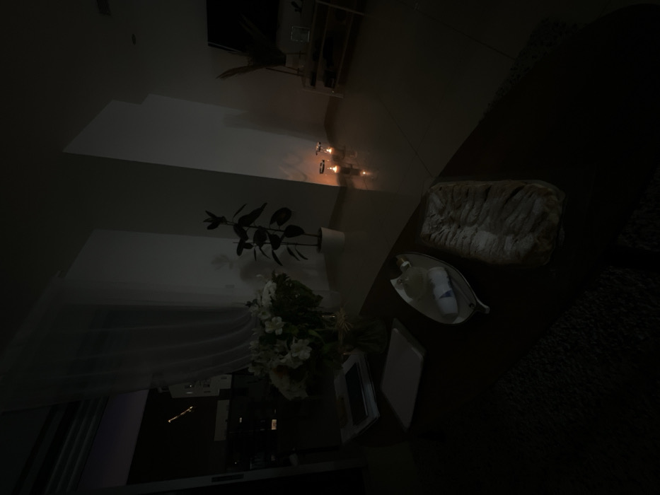 The image depicts an indoor residential scene in Ashkelon, Israel, characterized by low light conditions, primarily illuminated by two candles. The setting appears to be a living room or common area at night. In the foreground, a dark-surfaced coffee table occupies the lower half of the frame. On this table, a bouquet of light-colored flowers, possibly white or cream, is arranged in a clear vase. To the left of the flowers, a stack of flat objects, resembling papers or a tablet, is visible. To the right of the flowers, a silver, leaf-shaped dish holds a wrapped white item, potentially a food product like cheese. Adjacent to this dish, a rectangular baked good, possibly a strudel or pastry dusted with powdered sugar, is encased in clear plastic wrapping. A dark, textured rug is partially visible in the bottom left corner. In the mid-ground, two lit candles are placed on the tiled floor, casting warm light and reflections. Behind these candles and to the left, a potted plant with dark, broad leaves stands in a white pot. The floor is light-colored and reflective. The background features light-colored walls, likely white or off-white, with visible architectural angles. To the far left, a large glass door or window, partially covered by sheer white curtains, opens to a dark exterior. Through this opening, a nighttime cityscape with faint distant lights is discernible. A distinct, diagonal streaking light source is visible in the upper left portion of the exterior view. To the far right, a television set with a dark screen is mounted above a low, light-colored shelving unit containing a few indistinct objects. No individuals are present in the scene.
