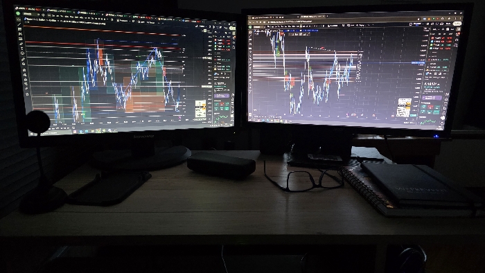 The image displays a dimly lit indoor scene featuring a wooden desk equipped with a dual-monitor computer setup, located in Veliko Tarnovo, Bulgaria. Two flat-panel monitors with black bezels are centered, displaying complex financial trading charts characterized by candlestick patterns and various indicators on dark backgrounds. The left monitor bears a "Lenovo" logo at its base. A black spherical webcam on a stand is positioned to the left of the left monitor. On the wooden desk surface, from left to right, are a black, flat, rounded object (possibly a phone or mousepad), a closed black hard-shell glasses case, a pair of black-framed eyeglasses resting open, and a stack of two notebooks (a spiral-bound one beneath a darker hardcover journal). The background is obscured by darkness, with faint vertical lines visible on the far left, suggesting blinds or a wall texture. No individuals are present.