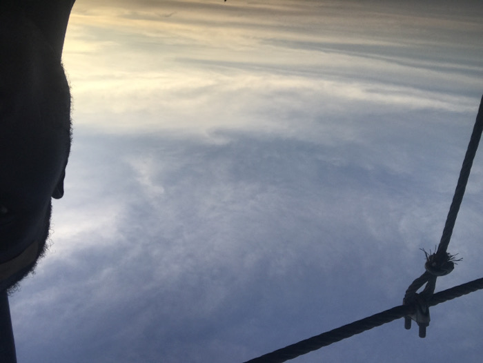 A low-angle shot features a person’s face in silhouette on the left side, partially obscuring the view. The background is a sky with thin, wispy clouds. A rope construction occupies the lower right corner of the frame, comprised of a main line and a shorter section attached with a metal clamp. The sky transitions from a light, possibly sunset-tinted color at the top to a darker blue lower in the frame.
