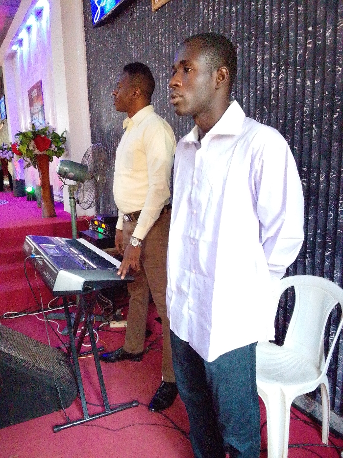 The image captures an indoor scene in Maigizo, Nigeria, featuring two adult males and musical equipment