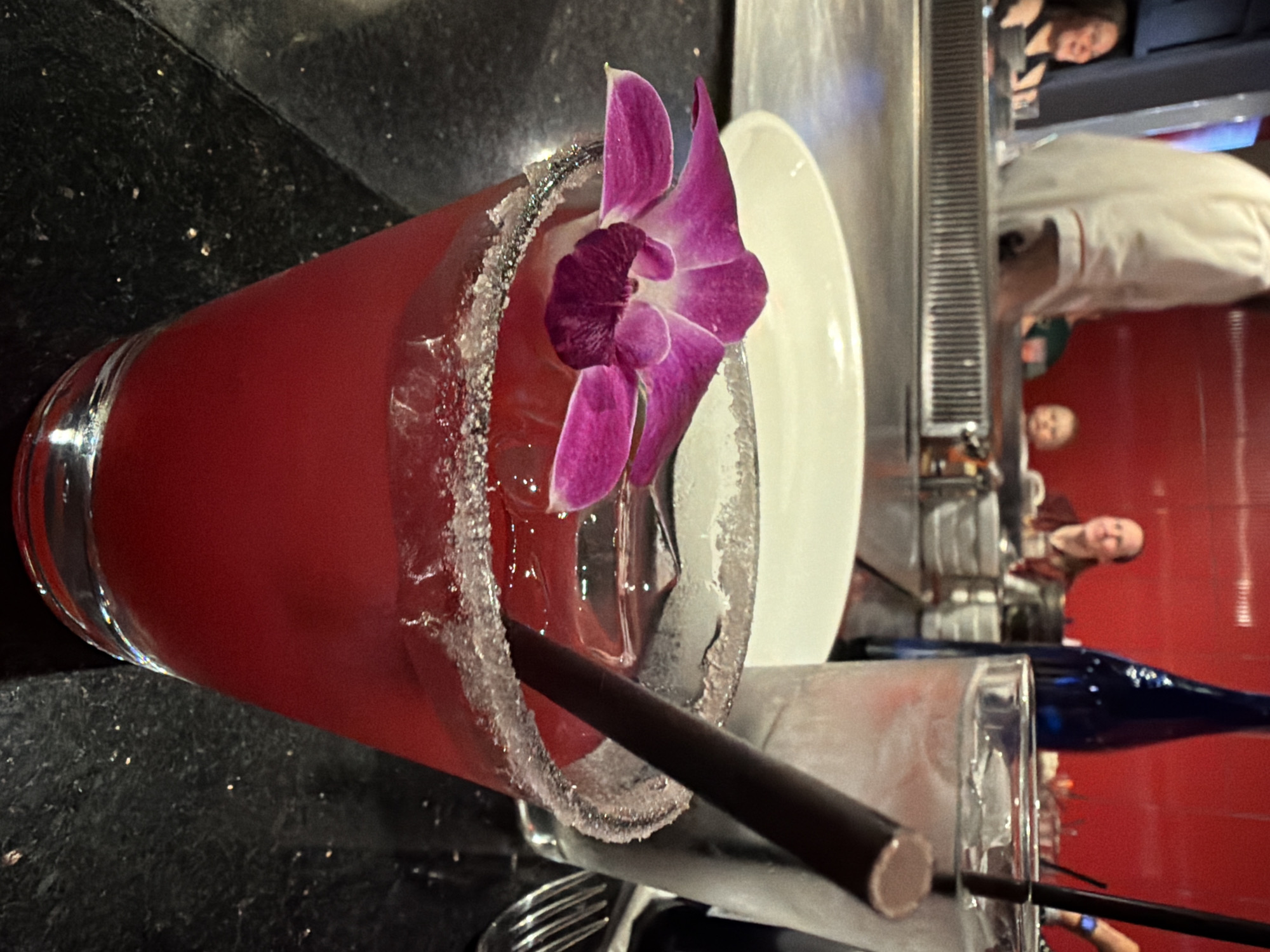 A pink cocktail with a sugared rim and a purple orchid garnish sits on a black surface in a bar or restaurant. A black straw is in the cocktail. Behind the cocktail are various bar items, including a plate, glassware, and bottles. Several people are in the background. It is impossible to definitively determine from this photo the precise location in Chicago.