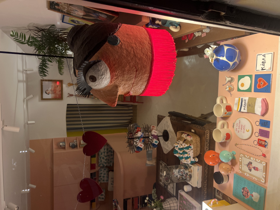 The image depicts the interior of a retail store, viewed through a window, likely a boutique or gift shop, in Athens, Greece, indicated by visible Greek text on merchandise. In the immediate foreground, a pink display surface presents various items: two white ceramic mugs with minimalist designs (one apple, one landscape), three small, glossy octopus figures (orange, tan, turquoise), a small white circular plaque inscribed with "SHE WAS THE EXACT STORY I WANTED TO WRITE.", a pair of pink socks with a paper band reading "ΝΑΝΑ" in Greek, two small square ceramic tiles (one depicting a fried egg, the other an eye with a heart), and a blue spherical vase with white spots. Additionally, necklaces, keychains with Greek text ("ΚΑΛΗ ΜΕΡΑ"), and framed illustrations are arranged. Dominating the mid-ground and right side is a large, stylized papier-mâché head sculpture, appearing to be a lamp. It features exaggerated facial characteristics, including a prominent nose, a large white eye, and dark, spiky hair/eyebrows. A bright red fringed lamp shade forms its lower section, emitting a reddish glow. Behind the foreground display, a dark, carved wooden table is laden with items: a clear glass jar containing various small objects, a woven basket filled with folded textiles, a small white grid-patterned vase with light-colored flowers, and several books or magazines. A tiered, rotating metal display stand showcasing keychains or small hanging items sits on a white doily on this table. The background reveals more of the shop's interior. A pale pink, fluted counter or shelving unit is visible on the left. In the center, a striped fabric curtain (vertical blue and white stripes) hangs. Above and to the right, a framed portrait of a stylized figure hangs on a wall. A large green potted plant is situated in the upper right. The ceiling features several white track lighting fixtures. Two large, translucent red heart shapes are strung across the upper left portion of the scene, connected by a fine white string. No people are visible, and no actions are occurring. The scene is a static display of merchandise.