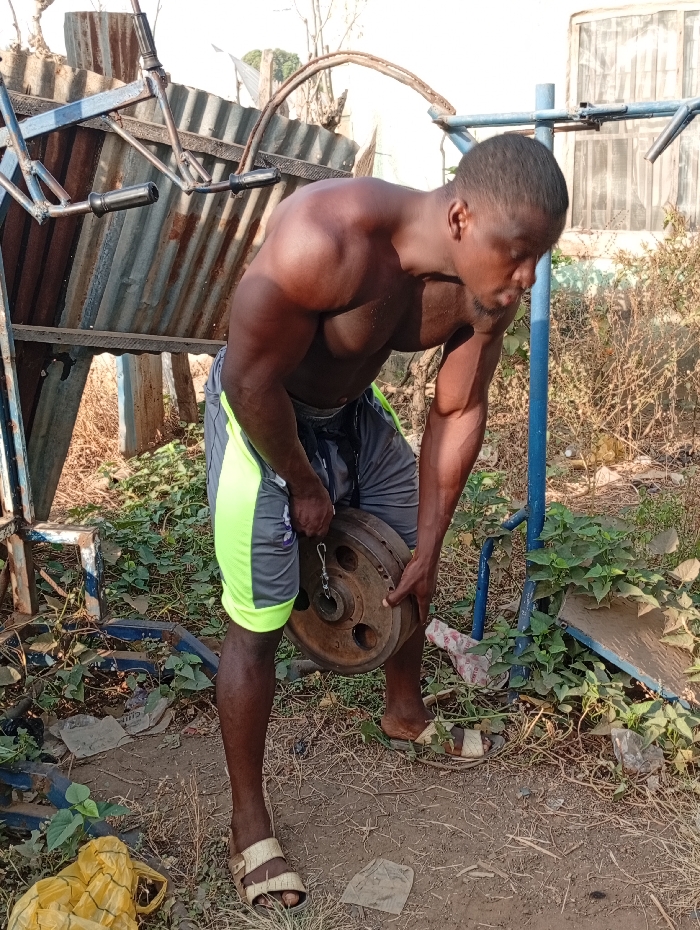 The image captures an outdoor scene in Akwanga, Nigeria, featuring a single muscular adult male. He is shirtless, exhibiting a developed upper torso, shoulders, and arms, and wears grey shorts with a bright green vertical stripe on the left leg, paired with light-colored open-toed sandals. The man is bent forward at the waist, hands grasping two circular, rusty metal weight plates that are connected via a metal pin and a carabiner clip. In the background to the left, a weathered and partially rusted makeshift gym structure is visible, constructed from blue metal piping and corrugated metal sheets, featuring a horizontal bar with black handles. To the right, another section of blue metal framing is present. The ground is unpaved dirt, littered with scattered dry leaves, green foliage, and various pieces of plastic debris, including a crumpled yellow plastic bag. Further back, additional vegetation and a building with a window are discernable under bright daylight.