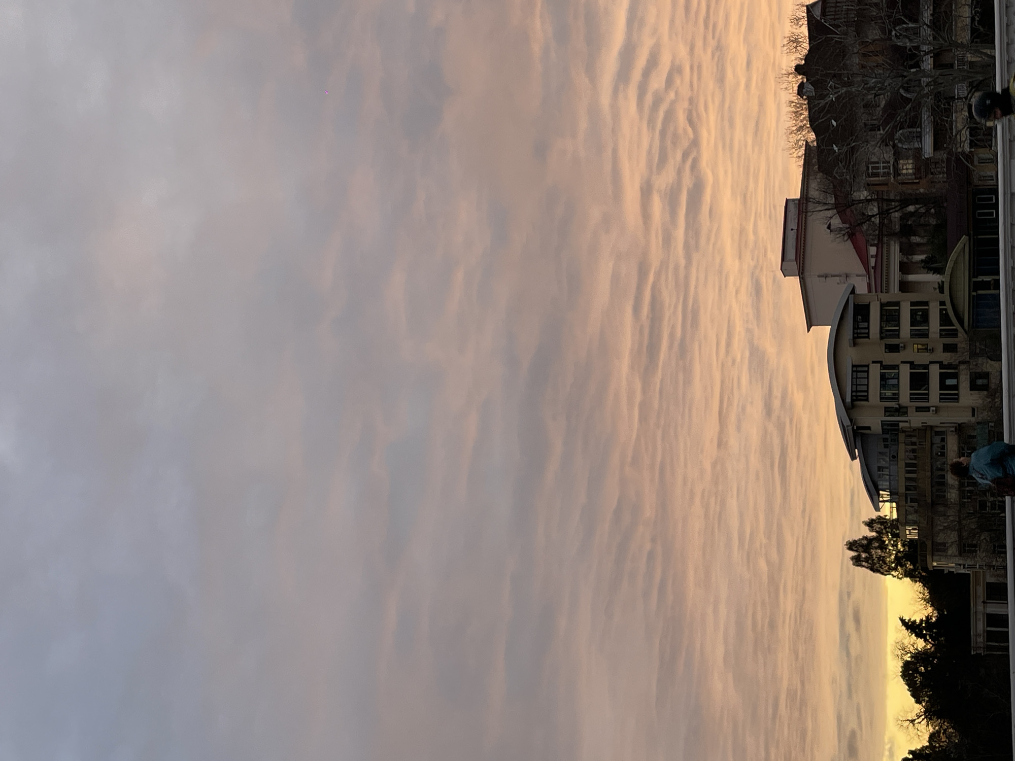 The image captures an urban landscape in Sochi, Russia, at sunset or sunrise, viewed from an elevated vantage point, likely a bridge or high balcony. The sky occupies the upper two-thirds of the frame, featuring altocumulus or stratocumulus clouds arranged in a rippled pattern. The sky color transitions from light grey-blue at the zenith to vibrant orange, pink, and yellow hues near the horizon, with the brightest yellow emanating from the lower left, indicating the sun's position. A faint, singular magenta pixel is discernible in the upper right sky. In the foreground, a dark, low horizontal barrier, possibly a railing, defines the immediate bottom edge. Two individuals are partially visible. On the left, a person faces away from the viewer, looking towards the horizon, wearing a teal-colored jacket and a dark backpack. On the far right, a second individual's head, shoulders, and a dark helmet are visible, suggesting they are either on a vehicle or walking. The midground and background consist of a densely packed cluster of buildings and trees, silhouetted against the bright horizon. Buildings exhibit a mix of architectural styles, including modern multi-story structures with flat or curved roofs and numerous rectangular windows, and older buildings, one featuring a classical facade with columns and a red-toned roof. Lush, dark green evergreen trees are interspersed with bare deciduous trees, some with intricate, visible branch patterns, suggesting a winter or early spring season. The terrain appears to be sloping, with buildings situated on various levels, indicative of Sochi's characteristic hillside development. The overall scene suggests a typical urban outlook within the city of Sochi, characterized by mixed architectural styles and a subtropical climate.