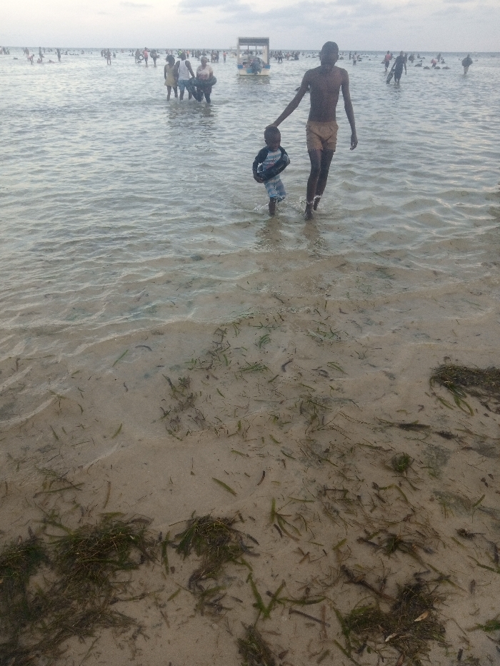 The image depicts a crowded coastal scene in Shanzu ward, Kenya. In the foreground, two dark-skinned individuals are wading through shallow water towards the viewer. A taller male, appearing to be an adult or older youth, is bare-chested and wears light-colored shorts, with water reaching his mid-thigh. He holds the right hand of a young male child. The child wears a blue and white striped long-sleeved shirt and light-colored shorts; he carries a black, tire-shaped inflatable ring in his left hand, and water reaches his mid-calf. The seabed visible beneath the clear-to-murky water is sandy and extensively covered with dark green aquatic vegetation, resembling seagrass or algae. In the mid-ground, a white boat with a canopy is positioned slightly left of center, surrounded by multiple individuals wading in the water. Numerous other figures are scattered across the distant water, suggesting a busy recreational area. The sky above is overcast and light grey, meeting the water at the horizon.