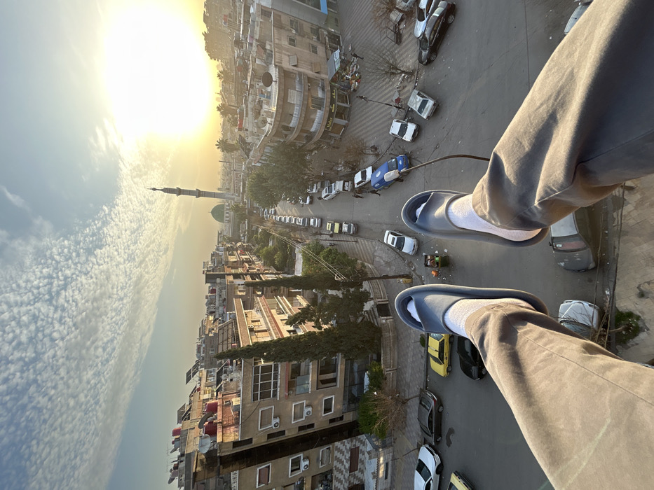 A high-angle, first-person photograph captured in Sarouja Municipality, Syria, displays an urban street scene during either sunrise or sunset. In the immediate foreground, a person's legs, clad in grey trousers, white socks, and dark grey slide sandals, extend downward into the frame, positioned as if hanging over a ledge. Below, a curved street is densely lined with parked vehicles, including white, black, and yellow cars, as well as a blue utility van with a black cable extending from it towards the lower right. Small figures, likely pedestrians, are visible on the sidewalks and near the vehicles, with one individual near a green cart on the left and a group gathered near the blue van. The street is flanked by multi-story residential and commercial buildings featuring concrete facades, balconies, rooftop water tanks (red and black), and solar panels. Several tall, slender cypress trees are interspersed among the buildings. In the middle distance, a prominent mosque with a tall, light-colored minaret and a green dome is visible. The sky above is light blue with extensive, textured altocumulus clouds, and a bright, low-lying sun creates a strong glare on the right side of the horizon.