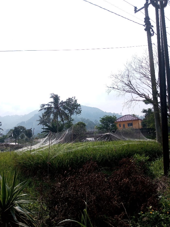 This image depicts an outdoor rural landscape in Sandamal Eliya, Sri Lanka, characterized by agricultural fields and distant hills under an overcast sky. In the foreground, dense green and brown foliage is visible, with a prominent spiky plant on the left. A field covered by a white net, likely for agricultural purposes, occupies the midground, with green crops growing beneath it. Several trees are scattered across the scene, including tall palm trees and a prominent bare-branched tree on the right. In the upper right quadrant, three utility poles with multiple power lines extend vertically, supporting horizontal lines that traverse the upper portion of the frame. Beyond the agricultural area, a light yellow single-story house with a red tiled roof is situated on an elevated plot, partially obscured by trees. Rolling, forested hills or mountains are visible in the distant background, fading into the hazy atmosphere. No individuals or specific human activities are observable.