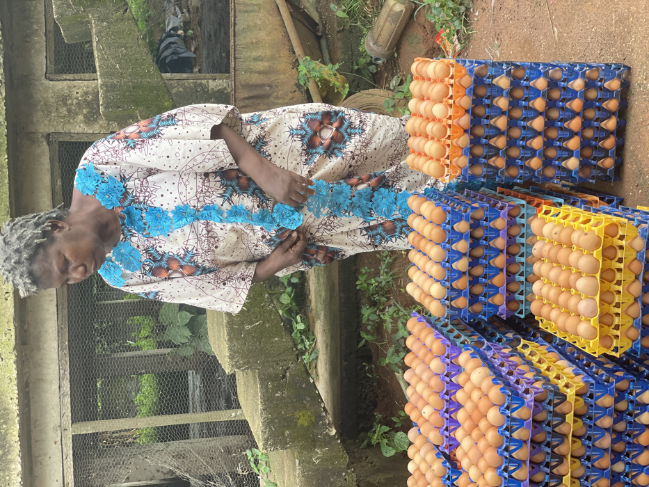 An outdoor scene in Ikorodu, Nigeria, depicts an adult female standing alongside multiple stacks of eggs