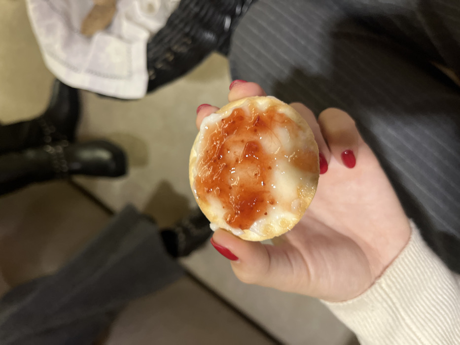 A person holds a circular cracker topped with a white spread and a layer of red jam or jelly. The person has red nail polish. The background includes striped pants, a light-colored sweater sleeve, black shoes or boots with possible chain detailing, and beige flooring. A white napkin or cloth is also visible. The image appears to be taken from an overhead perspective.