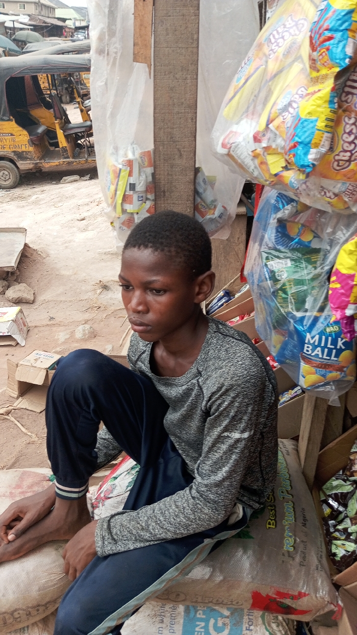 A young individual, appearing male, with short dark hair and light brown skin, is seated barefoot on two large, light-colored sacks at an outdoor market stall in Onitsha, Nigeria