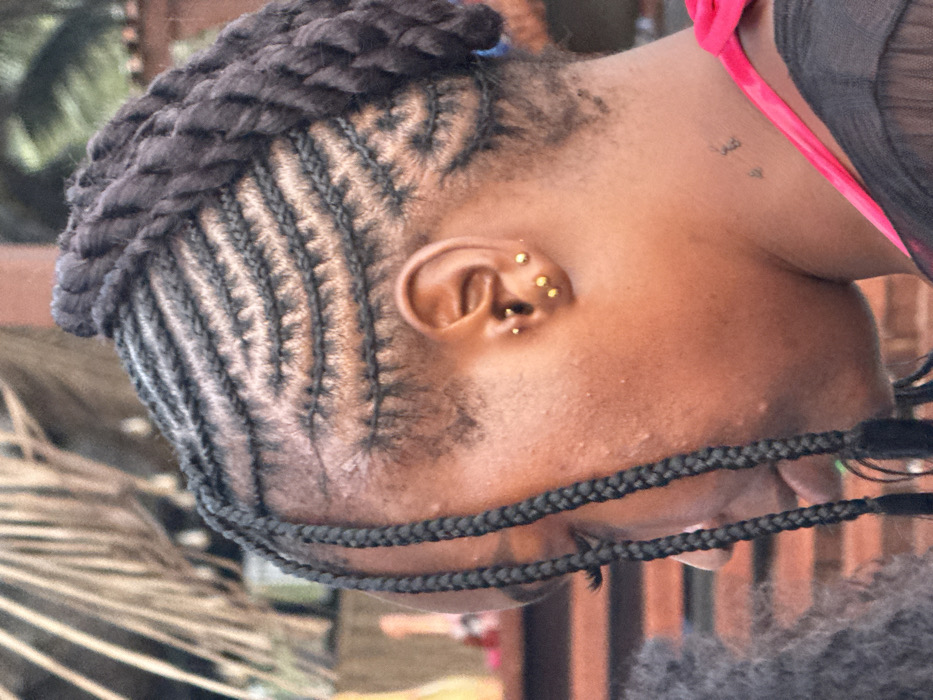 A close-up shot of a woman’s head with intricately braided hair styled in cornrows, gathered into a bun. The braids run along her scalp. Her right ear is visible, adorned with multiple gold stud earrings. A small tattoo is located on her neck. The woman's face is partly visible, showing her eye and cheekbone. She appears to be wearing a dark-colored mesh top. The background includes greenery and a wooden fence, slightly blurred.