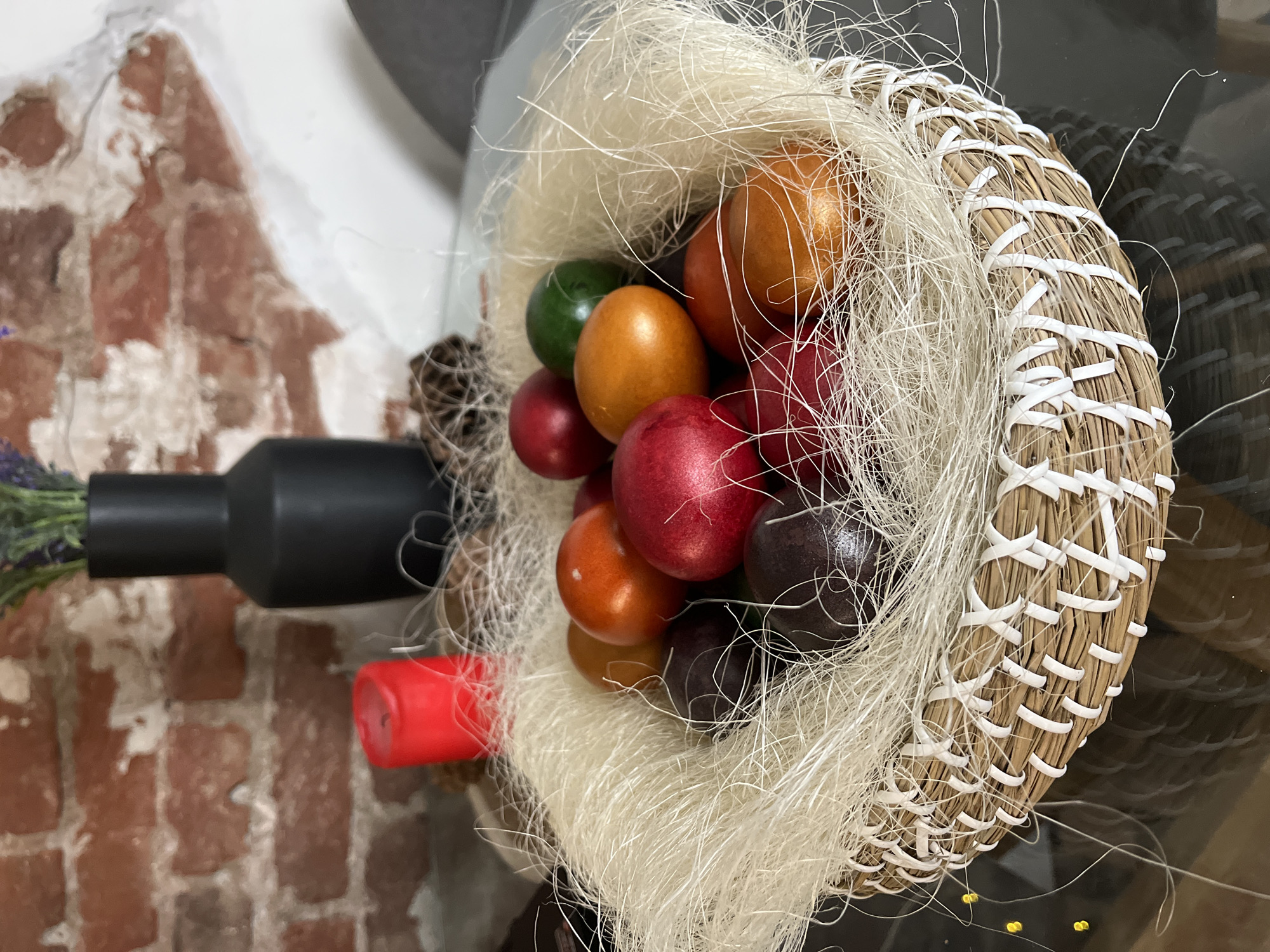 A still-life composition features a woven cornucopia filled with colorful, varnished wooden eggs of red, green, orange, and brown hues