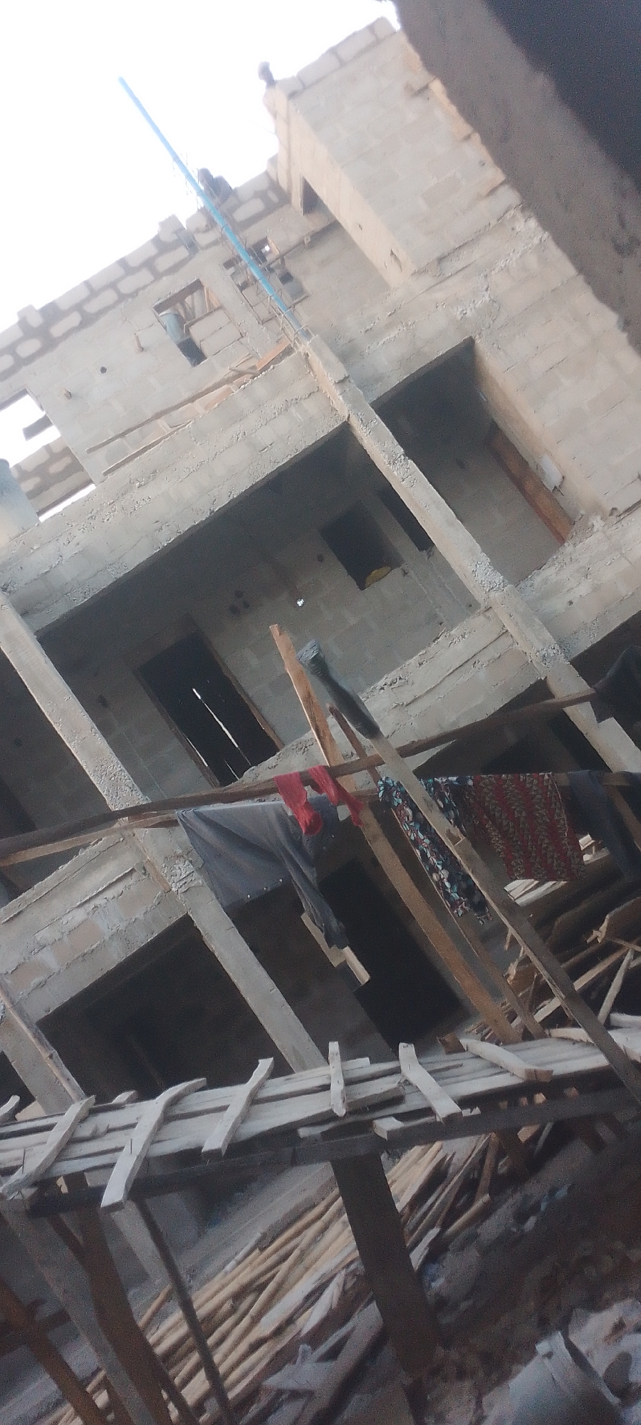 The scene depicts an upward view of an unfinished multi-story concrete block structure located in Lokoja, Nigeria, against a bright, overcast sky. The building's exposed framework consists of concrete block walls, reinforced concrete columns, and beams across multiple levels. Numerous rectangular openings are visible, serving as uninstalled windows or doorways. A light blue PVC pipe runs vertically along the exterior of the building's upper section, secured by smaller vertical supports. Extensive wooden scaffolding, planks, and beams are present throughout the lower and mid-levels, forming temporary supports and a partial roof structure. Three distinct pieces of clothing—a dark garment (possibly a shirt), a red fabric, and a multicolored patterned fabric—are hanging from a horizontal wooden beam in the mid-ground. No individuals are visible within the frame.