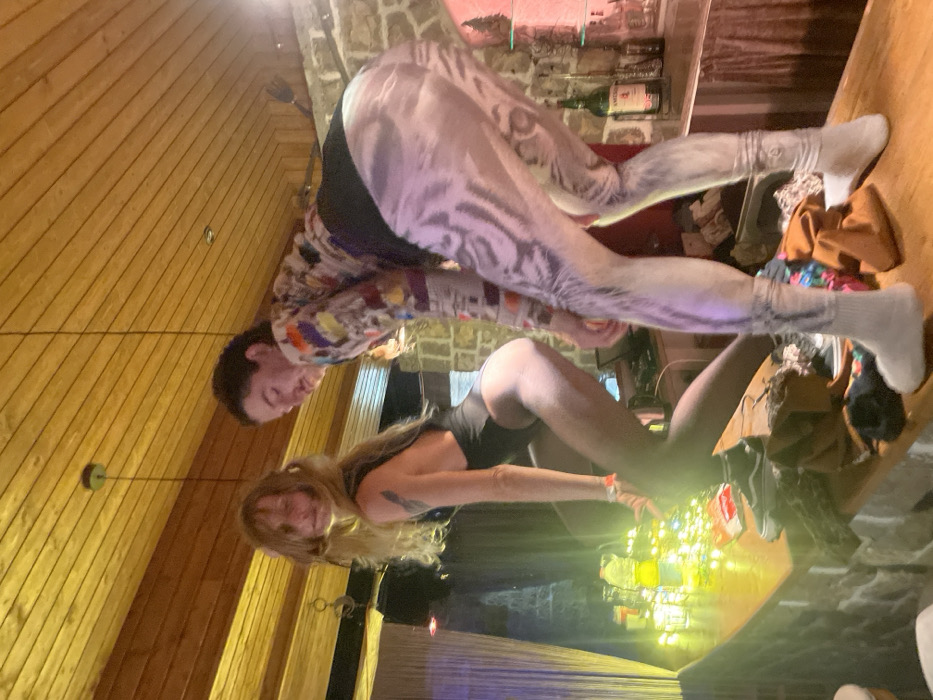 Two figures dominate the frame. Above, a person with short dark hair wears a multi-colored patterned shirt and gray leggings with a subtle animal print. Below, a woman with long blonde hair wears a black bodysuit and sheer black tights. They appear to be in a room with wood paneled walls and a stone section. A bar with bottles is partially visible. Light shines from below, highlighting the lower figure. Miscellaneous objects clutter a surface on the right.