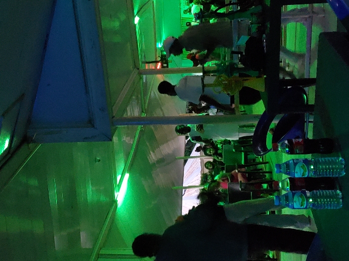 People sit around tables in a green-lit room. Some wear white shirts or hats. Blue water bottles and dark soda bottles are visible on a table. The room's structure includes metal beams and angled supports. The lighting is predominantly green, casting a vibrant hue throughout the space.