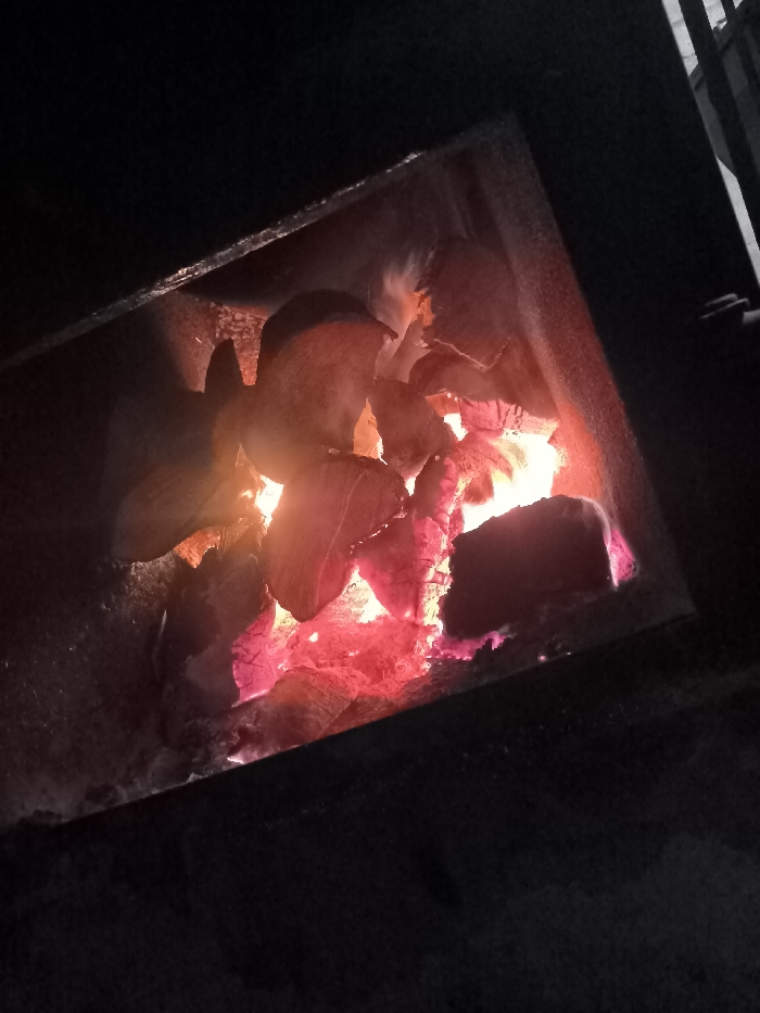A close-up, angled forensic view depicts a contained fire within a dark, rectangular structure. The internal chamber is filled with glowing red and orange incandescent wood or charcoal embers, actively undergoing combustion. Flames and wisps of smoke are visible emanating from the irregularly shaped, burning material. The interior walls of the container appear dark and slightly textured, likely metallic. The immediate external environment surrounding the structure is dark. No individuals are present. This scene is located in Panichishte, Bulgaria.