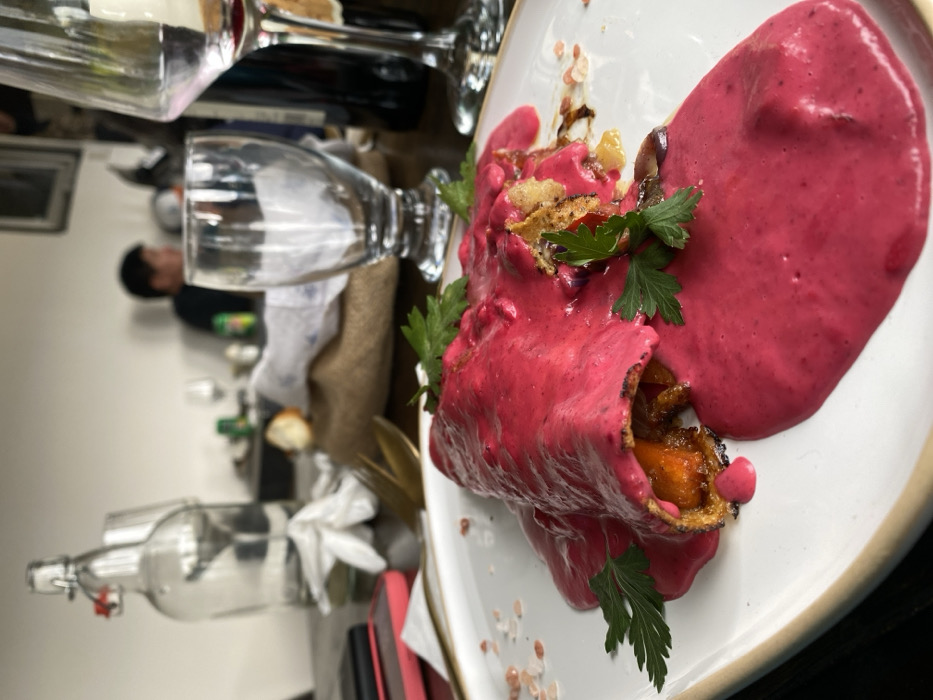 A plated dish features a rolled pastry filled with what appears to be roasted vegetables, possibly carrots. The pastry is covered with a vibrant pink sauce, and a dollop of the same sauce sits adjacent to the roll. Fresh green parsley sprigs garnish the dish. Pink salt crystals are scattered on the plate. A table setting with glassware, a water bottle, and a person are visible in the background.