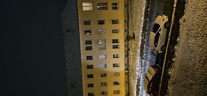 A tall, beige apartment building with numerous windows stands adjacent to a snow-covered street. Two parked cars, one white and one red, are visible on the street. The building's architecture is simple and utilitarian. The lighting suggests it is nighttime or a dimly lit area. Snowfall covers the ground and the cars, creating a wintry scene. The building's exterior wall shows a darker shade on one side, suggesting a variation in material or lighting.