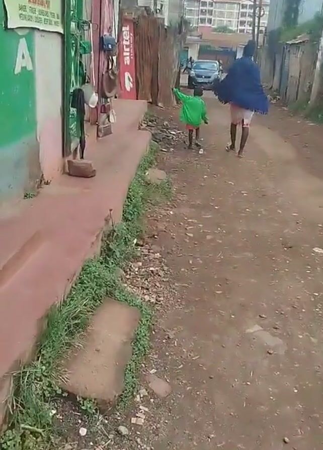 The video depicts an adult and a young child walking away from the camera on a narrow dirt road lined with buildings and fences. The adult, wearing a shawl and shorts, walks alongside the child, who is wearing a bright green jacket. The road surface is uneven, with dirt, rocks, and scattered debris. In the background, a car is parked, and other people can be seen walking further down the road. Buildings of varying heights flank the road. The overall impression is that of a residential area in a developing country.