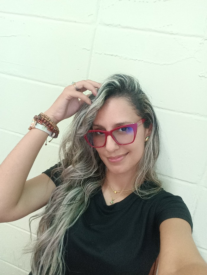 A woman with wavy, blonde-grey hair and red glasses poses close to a white textured wall. She wears a black t-shirt, multiple necklaces, and bracelets. Her hand is in her hair near her forehead, showcasing a ring. She is looking directly at the camera with a slight smile.