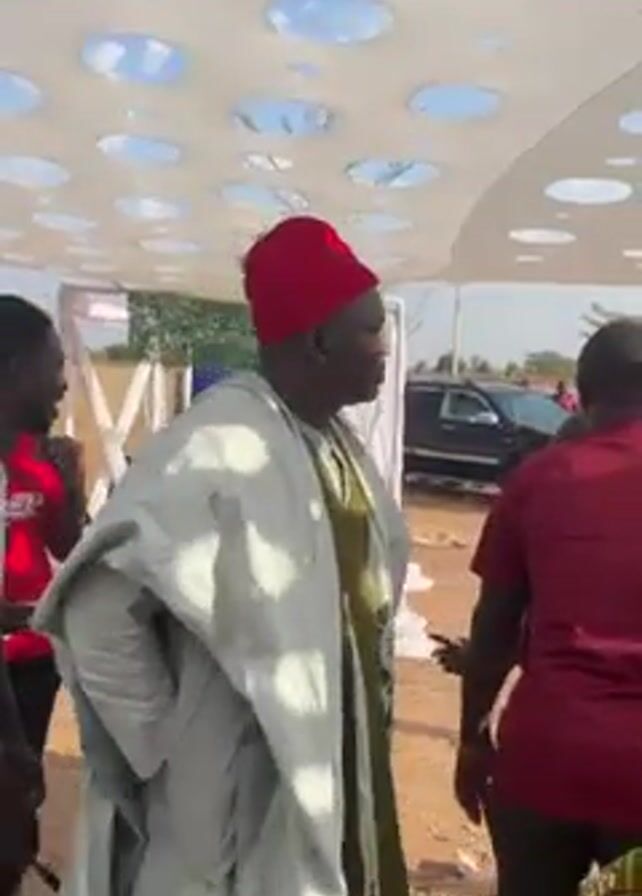 man in traditional attire, including a white robe with green and black embroidery and a red fez-like hat, standing amongst a group of people. The setting appears to be an outdoor event, possibly a celebration or gathering, as indicated by the white tent-like structure overhead, which has circular cutouts. A person to his left, in a white shirt with black stripes, is holding a small drum and appears to be interacting with the man in the robe. Other individuals are visible in the background, including one wearing a red shirt. There are parked cars and a glimpse of buildings in the distance. The scene is bustling with activity, suggesting a social gathering.