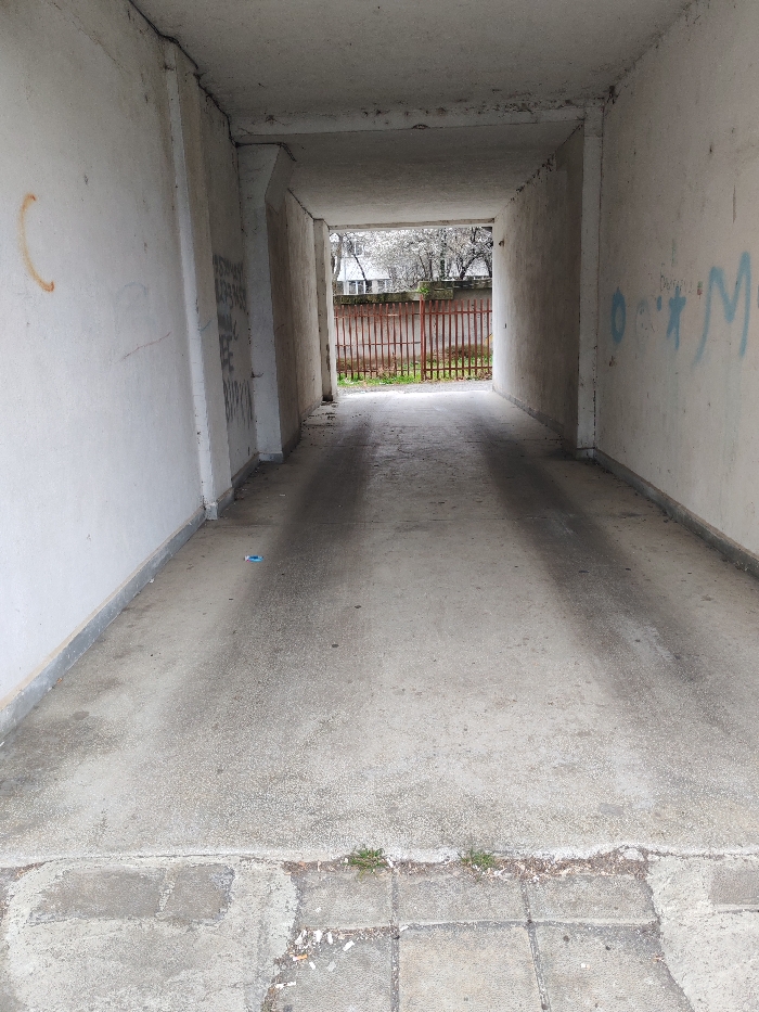 The image displays an empty, concrete underpass or passage, reportedly located in Burgas, Bulgaria