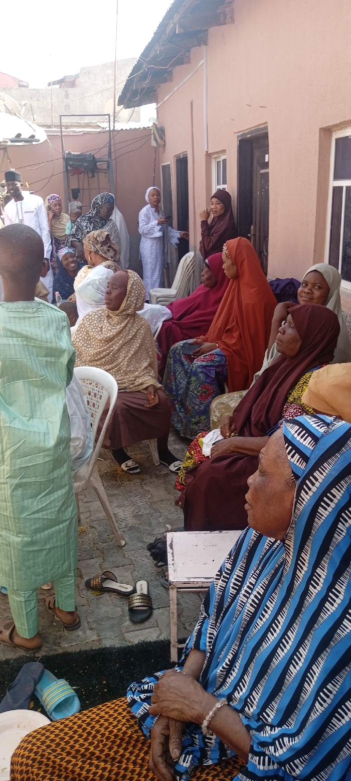 The image depicts an outdoor social gathering in Sabon Gari East, Nigeria