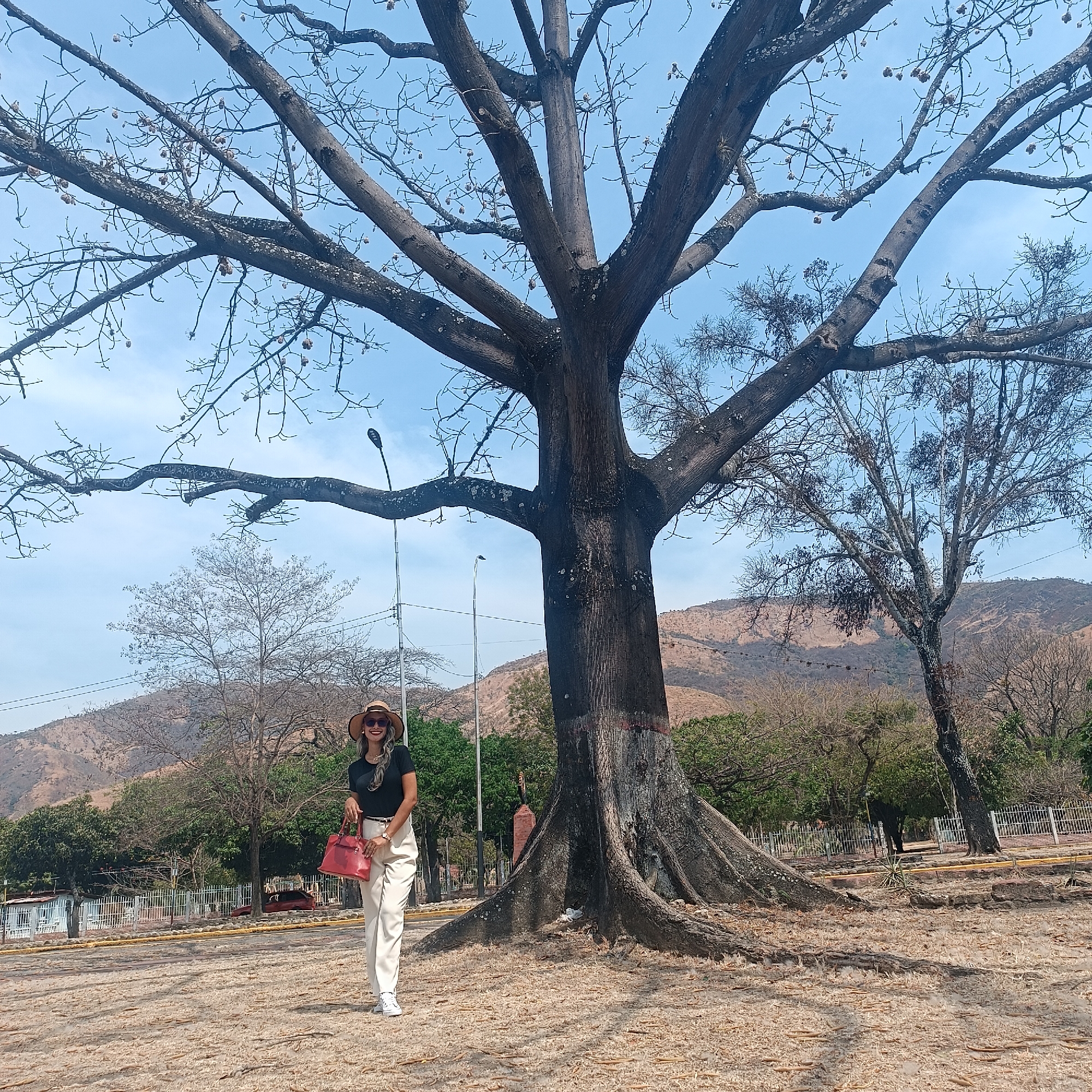 The image displays an outdoor scene in La Victoria, Venezuela, under a clear blue sky with sparse clouds. A female subject stands in the foreground, slightly left of center, positioned in front of a massive, mature deciduous tree. She is observed smiling, wearing a wide-brimmed straw hat, sunglasses, a black short-sleeved top, light beige trousers, a brown belt, and white sneakers, holding a red handbag in her left hand. The central feature is a large tree with a thick, dark trunk exhibiting prominent buttress roots and a wide canopy of bare, branching limbs. Numerous small, light-brown, spherical seed pods are visible on its branches. The ground is dry, light brown soil with scattered organic debris, possibly fallen leaves or seed pods from the tree. Near the base of the tree trunk, faint red markings are present. In the mid-ground, a white metal fence with vertical bars delineates an area. Behind this fence, a small white building with a red roof and a partially visible red vehicle are located. Multiple dark-colored streetlights with overhead fixtures are visible, rising above the fence line. The background features additional trees, some bare and some with green foliage, leading to dry, undulating brown mountains under the horizon.