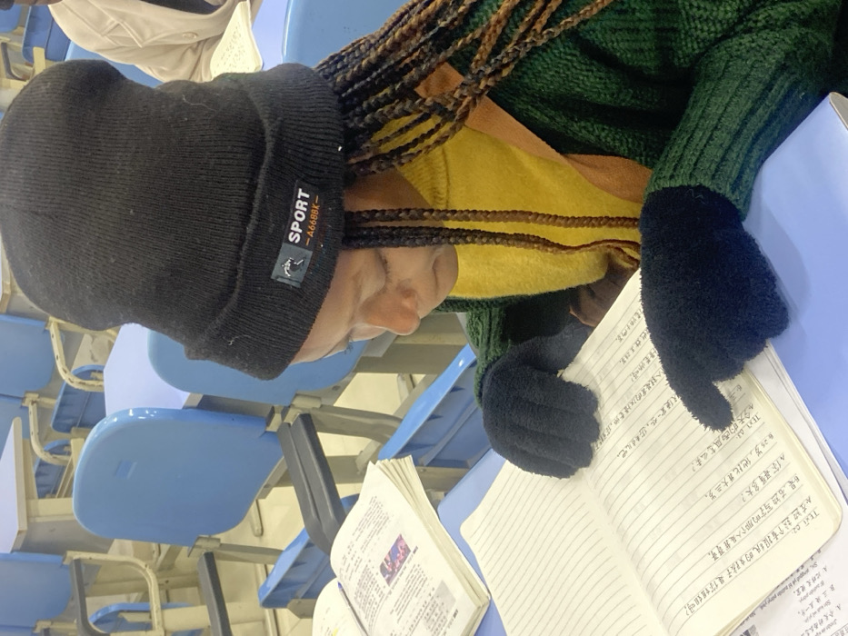 A person wearing a black beanie and dark gloves is sitting at a desk, writing in a notebook. The notebook contains Chinese characters. The person also wears a green sweater and a yellow and brown garment. An open book sits next to the notebook. The background shows empty blue chairs, suggesting a classroom or auditorium setting. The beanie has a "SPORT" tag with the identifier "A6688K."