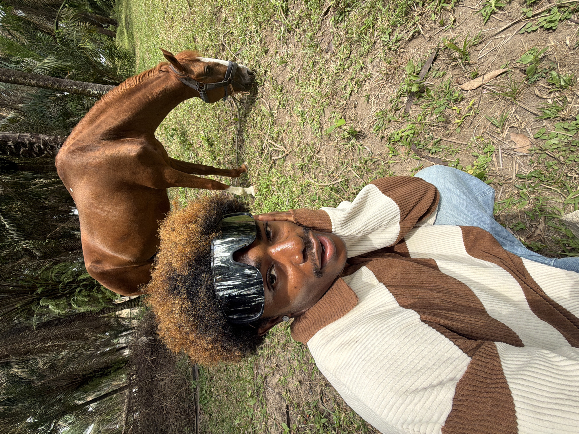 An outdoor scene in Sangotedo, Nigeria, features an adult male in the foreground and a horse in the mid-ground. The male, with dark skin and a two-toned afro hairstyle (dark roots, lighter brown/orange ends), wears large reflective visor-style sunglasses. He is dressed in a collared, long-sleeved corduroy sweater with broad horizontal stripes of off-white and brown, paired with light blue jeans. Crouching, he looks directly at the camera, his left hand resting on his left cheek. A small stud earring is visible in his left ear, along with a thin mustache. The horse, a bay with a white blaze on its face and white markings on its lower front leg, wears a dark bridle and is positioned with its head down, grazing on the sparse grass. The ground is a mixture of green grass and exposed soil, with some dried foliage. The background consists of dense vegetation, primarily tall palm trees, and a pile of dried brush to the left. The scene is illuminated by bright daylight.