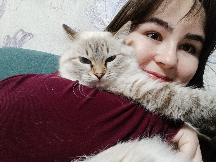The image depicts an indoor scene featuring a human female and a domestic cat, located in an unspecified residence within the city of Noviy, Russia