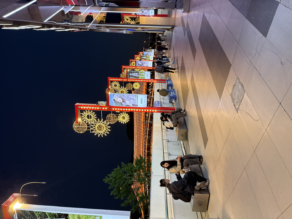 The image depicts an illuminated outdoor pedestrian walkway at night, located in Xicheng District, China. The scene is dominated by artificial lighting. The walkway surface is tiled with a pattern of light grey and darker rectangular sections. Cracks are visible across several light grey tiles, notably a distinct square patch of damaged tiling is present in the mid-ground. Along the left side of the walkway, multiple light-colored rectangular metal benches are positioned. Each bench appears to have a stylized trash receptacle symbol on its visible end. Adjacent to the benches, a series of vertically oriented structures with red frames and golden, sun-shaped light fixtures extend into the distance. Each structure also displays a large vertical advertising banner, with "AIGLE" text visible on at least one. A low concrete barrier borders the left side of the walkway, behind which a few small green trees and traditionally styled Chinese buildings with orange-lit eaves are visible. To the far right, a modern building facade with vertical light strips and reflective surfaces is present. The sky above is dark and clear. Approximately 10-15 individuals are present in the scene. In the foreground, two individuals are seated on a bench. The person on the left, wearing a dark jacket and pants, with hair in a bun, is facing the person on the right. The person on the right, wearing a light-colored top and dark pants, is holding a clear bottle and facing the left individual, appearing to be in conversation. Further back on a separate bench, two individuals are seated; one is leaning forward, looking at a mobile phone. Another single individual is seated on a bench further down the walkway. In the mid-ground to the right, a group of several individuals are walking away from the viewer. One person in this group is actively using a floor-cleaning tool (resembling a mop or broom) on the tiled surface.