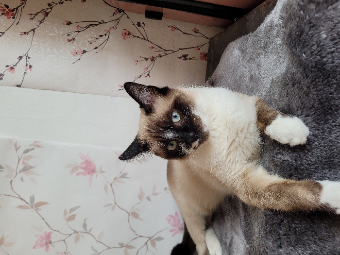 A Siamese cat with striking blue eyes and dark brown facial markings reclines on a grey, textured surface. The cat's body is primarily white, contrasting with the dark brown markings on its paws and ears. The background features a wall with floral wallpaper in muted pink and brown tones, creating a soft, decorative backdrop.
