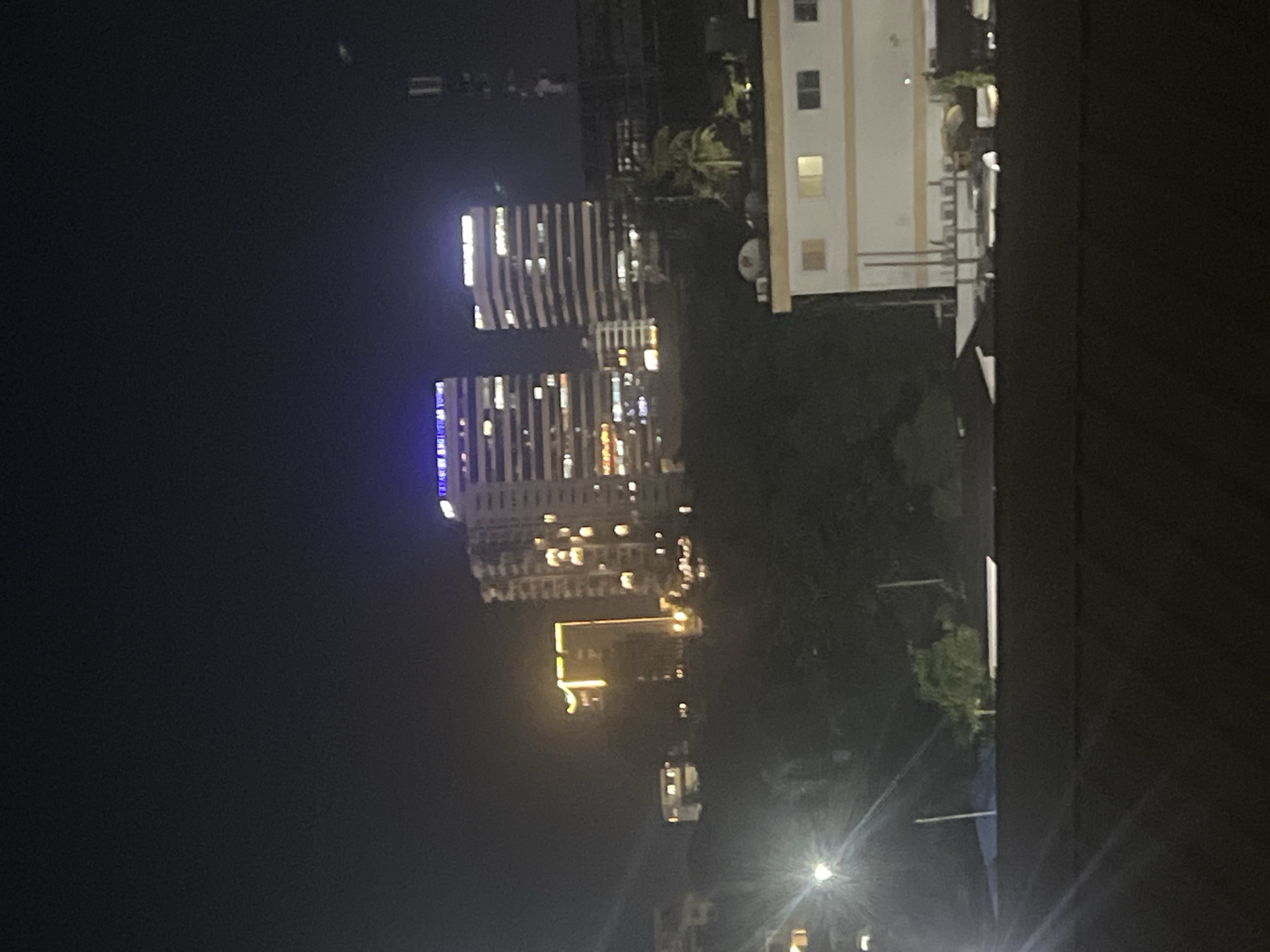 The image presents a nighttime cityscape view of Dar es-Salaam, Tanzania, captured from an elevated perspective, likely overlooking the central business district. The foreground is occupied by a dark, indistinct rooftop or ground surface, with a bright street lamp on the lower left exhibiting a pronounced starburst effect. To the immediate right, the upper section of a light-colored building, featuring multiple illuminated rectangular windows and a dark brown top edge, is partially visible. The midground consists of a dark, undulating landscape, heavily covered in vegetation, indicating a hillside or dense tree cover. Within this area, a few smaller, less prominent buildings are sparsely located, showing minimal internal illumination. The background is dominated by a cluster of modern high-rise buildings, brightly illuminated against the dark night sky. The most prominent structure, centrally located, is a multi-story building featuring a blue illuminated sign at its apex, which legibly displays the text "TANZANIAN & INDUSTRIAL TOWERS." This building's facade is characterized by numerous illuminated rectangular windows. To its immediate right stands another tall building with distinct horizontal architectural banding and multiple illuminated windows. This second high-rise also possesses a blue illuminated sign at its summit, though the text is less clear. Further to the left and slightly behind these central towers, a third high-rise building is visible, notable for a distinctive yellow, 'T'-shaped illumination on its upper facade. To the far right of the scene, a tall, slender telecommunication tower or similar mast is present. No discernible people, specific actions, or interactions are visible in the static scene.