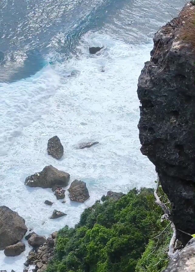 A high-angle shot shows the ocean waves crashing against rocks near a cliff