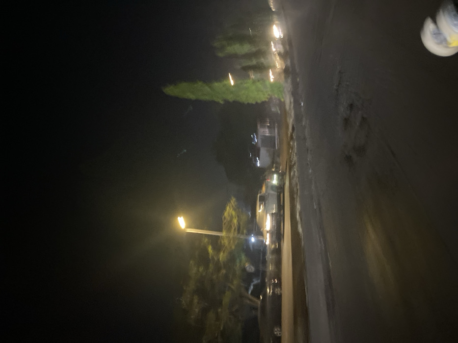A nighttime scene depicts a street lined with trees and streetlights. Cars are parked along the roadside, with a building visible in the background. The asphalt street appears wet, reflecting the ambient light and revealing some road imperfections. A portion of a white object is also seen on the road. The overall atmosphere is dark, illuminated by the streetlights and vehicle headlights.