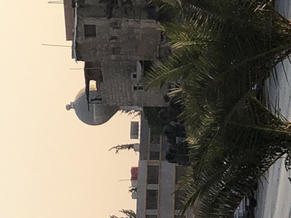 The image depicts an urban scene within Kafr Sousa Municipality, Syria, under the soft, warm light of either dawn or dusk, casting an orange hue across the clear sky. In the immediate foreground, the dark green fronds of several palm trees partially obscure the lower portion of the view. Behind the foliage, the midground features a row of structures. On the right, an old, multi-story stone building with a weathered facade and small, irregularly placed windows is visible; its upper level appears partially open or damaged, and thin antennae protrude from its roof. To the left, a more modern, lighter gray building with multiple rectangular window frames can be seen, topped with a red-covered object and sparse, dark vegetation. Indistinct dark shapes, possibly vehicles or military equipment, are faintly visible at street level between these buildings, partially obscured by the palm trees. Dominating the background is a large, light gray spherical dome structure, topped with a finial, situated behind the older building. No people are discernible, nor are any specific actions or interactions evident within the still scene.