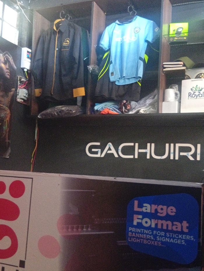 This image depicts the interior of Gachuiri Printing Press, located in Nyeri, Kenya. The scene features a commercial display area with dark walls and a dark, multi-compartment shelving unit. On the upper left, a dark uniform shirt with a yellow collar and cuffs, featuring a light-colored mountain-like logo on the chest, hangs in a compartment. Adjacent to it, a light blue Manchester City Football Club jersey with black shorts is displayed. Below these garments, folded items of clothing and clear plastic packaging are visible. The right section of the shelving unit holds a small green box, several stacked dark-covered items resembling books or binders, a white paper bag with a green and gold "Royal" logo, and two white mugs or cups. An abstract, dark artwork depicting a human profile is partially visible on the far left wall. Below it, a white electrical voltage stabilizer is mounted, with exposed wiring connecting to an open electrical box. In the mid-ground, a dark surface serves as a counter or sign, displaying the white sans-serif text "GACHUIRI". The foreground contains a partial white sign with red circular patterns on the lower left. On the lower right, a dark sign features a blue, rounded rectangular overlay with white text: "Large Format" in a larger font, followed by "PRINTING FOR STICKERS, BANNERS, SIGNAGES, LIGHTBOXES...". No individuals are present in the scene.