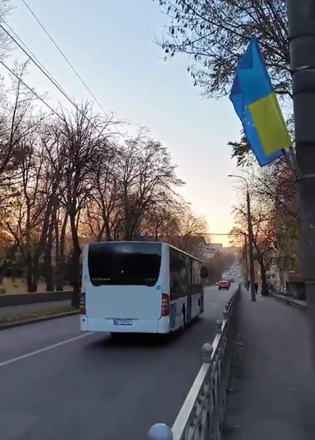 street scene. A white Mercedes-Benz bus is moving down the road away from the camera. A white van follows behind it. A Ukrainian flag hangs from a street light on the right. There are trees lining the road on both sides, and a metal fence separates the sidewalk from the street. The sky is visible in the background, with a hint of sunset.