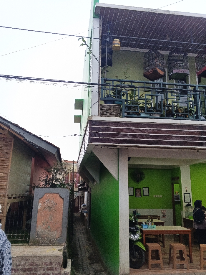 This image depicts a narrow urban passage between two buildings under an overcast sky in Pinnwe, Myanmar (Burma). The building on the right is a two-story structure with lime green walls and white trim. Its ground floor is an open-fronted establishment, likely a cafe or shop, with interior walls also painted lime green. This space contains several wooden tables with light brown plastic stools. A green motorcycle, partially showing license plate characters "4688 Y," is parked at the entrance. A person wearing a dark head covering is visible on the far right, standing behind a counter. Framed pictures and a wall-mounted fan adorn the interior wall. The second floor of this building features a balcony with a dark slatted roof and a dark green metal railing with a geometric pattern. Multiple potted plants are arranged along the railing. Three bird cages, including a light brown one and one with a dark frame and red base, hang from the balcony ceiling. A yellow cylindrical object also hangs from the ceiling. The building on the left is a single-story structure with a dark, sloped roof and light brown walls, featuring a section with horizontal bamboo-like cladding. In front of this building, a low, concrete barrier, painted orange and grey, is present, with sparse vegetation behind it and a metal fence. A narrow alleyway, paved with dark reddish-brown bricks in a herringbone pattern, separates the two buildings and recedes into the background, where additional electrical wires and poles are visible. Multiple black electrical power lines traverse the upper portion of the image. One individual is partially visible on the extreme lower left, wearing a light-colored, patterned garment. A second individual is partially visible inside the ground floor of the green building, standing behind a counter.