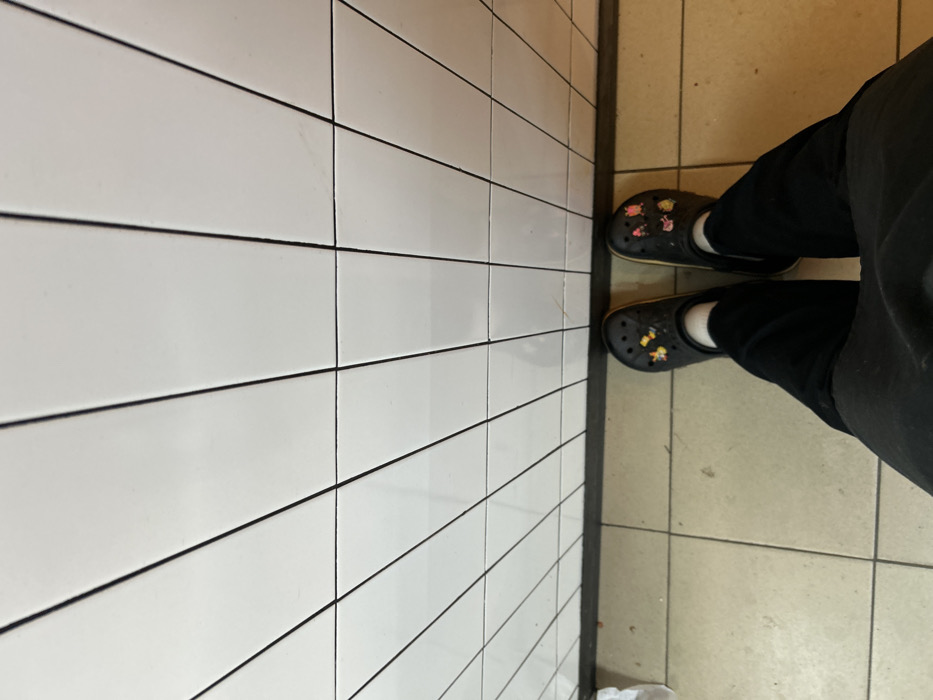 A person stands on a tiled floor next to a tiled wall. They are wearing black Crocs with socks and dark pants. The Crocs have decorative charms. The floor tiles are light brown or beige, while the wall tiles are white with dark grout lines. The photograph is taken from an overhead perspective, focusing on the person's feet and a portion of the wall.