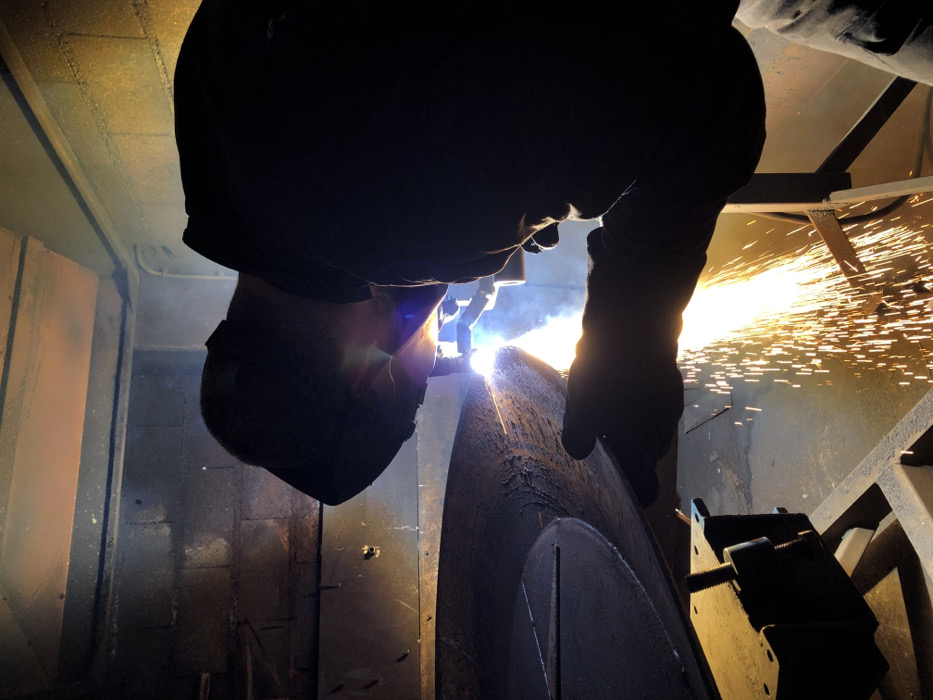 In a workshop located in Tomba, Montenegro, a person is depicted from the mid-torso up, predominantly silhouetted against a bright arc
