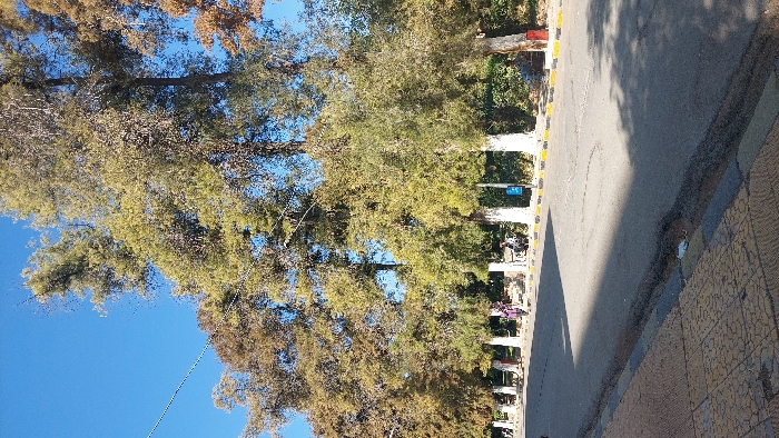 This vertical daytime photograph depicts a street scene within Ash-Shaghour Municipality, Syria. In the immediate foreground, a tiled sidewalk with a brown and grey pattern is visible on the left. This transitions to an asphalt road, which is partially illuminated by sunlight, creating distinct shadow patterns. A gutter runs along the edge of the road, containing a small white discarded object, possibly a face mask. Along the right side of the road, a raised curb with yellow and black painted markings delineates a treelined area. A row of tall trees with varied green and brownish foliage stands prominently, their lower trunks painted white. Behind these trees, a path or park area is discernible. Several individuals are present in the midground: 1. A person wearing dark clothing, possibly purple or maroon, is walking left-to-right behind the treeline, near the center of the image. 2. Further right and slightly behind, another individual is seated on a bench or low wall under a tree. 3. Even further right, a third individual is seated, partially obscured by foliage. 4. To the left of the walking person, near the treeline, a person is seated on a small motor vehicle, likely a scooter or motorcycle. A blue rectangular trash receptacle is visible attached to a tree trunk on the right side. A faint red object, possibly a pole or another receptacle, is situated further right near the curb. The background consists of dense foliage from taller trees and a clear, bright blue sky. Thin white utility wires are visible stretching diagonally across the upper left quadrant of the sky.