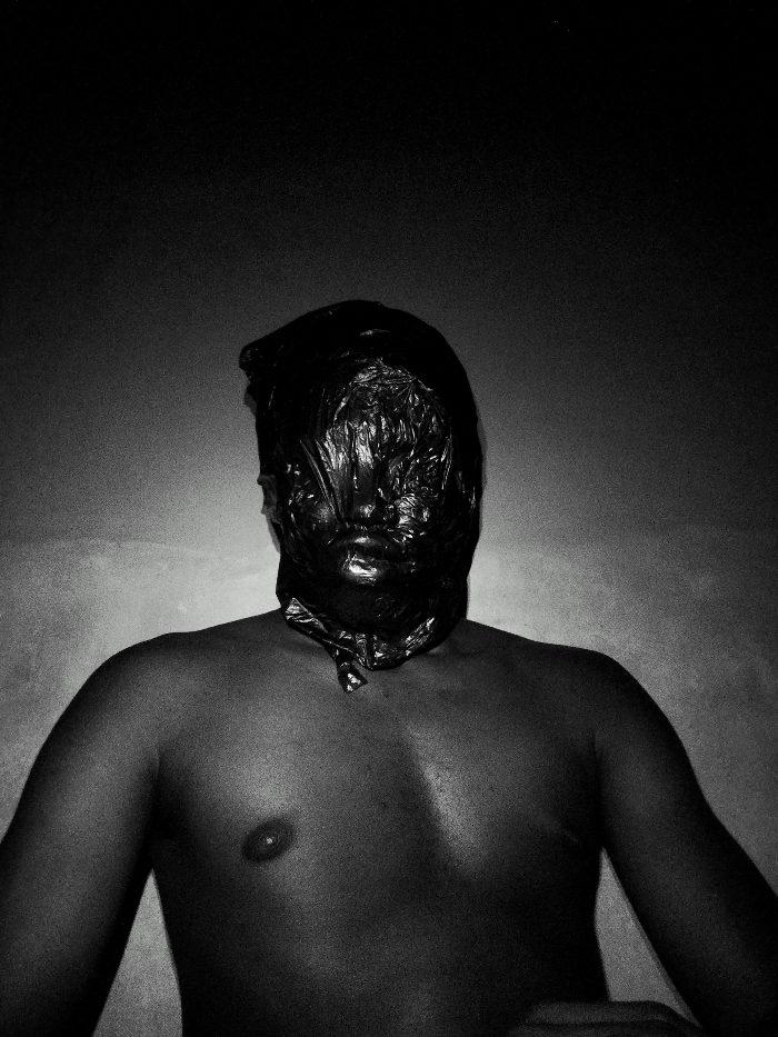 A shirtless person stands against a gradient background, their head entirely covered by a shiny, dark plastic bag. The bag is gathered tightly around their neck. The stark contrast and monochromatic palette accentuate the discomforting nature of the image, drawing attention to the obscured identity and possible sense of suffocation. The lighting highlights the folds and texture of the plastic, adding depth to the unsettling composition.